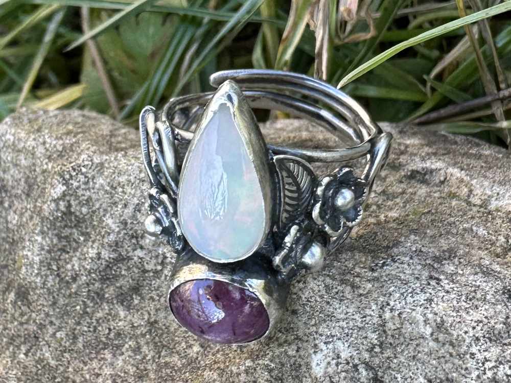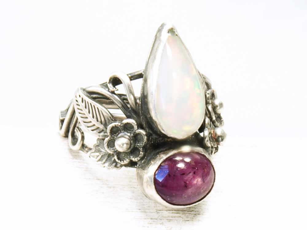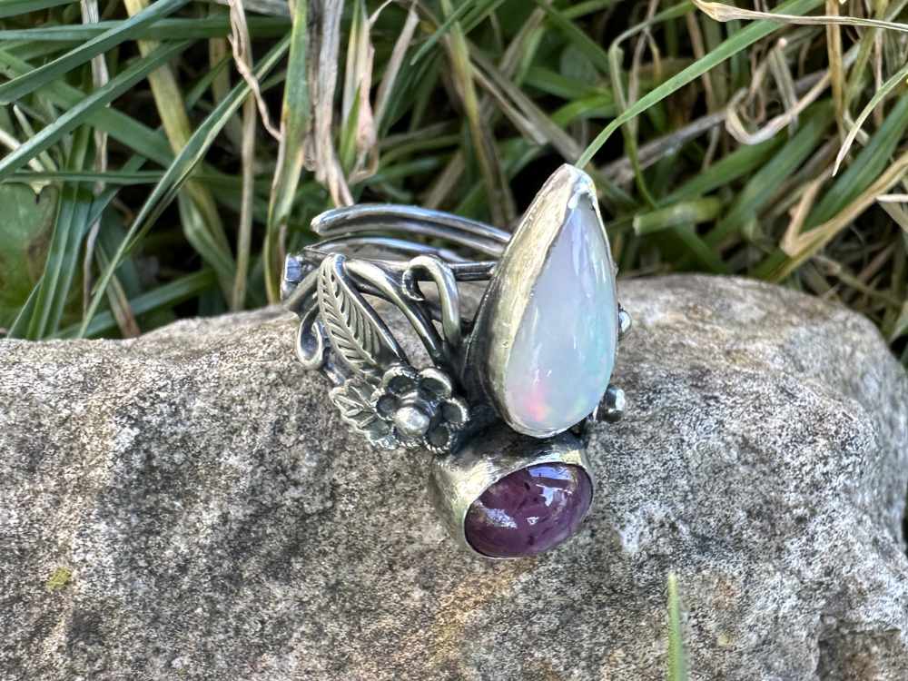 Blumenring Silber, Opal, Sternrubin, Unikatschmuck