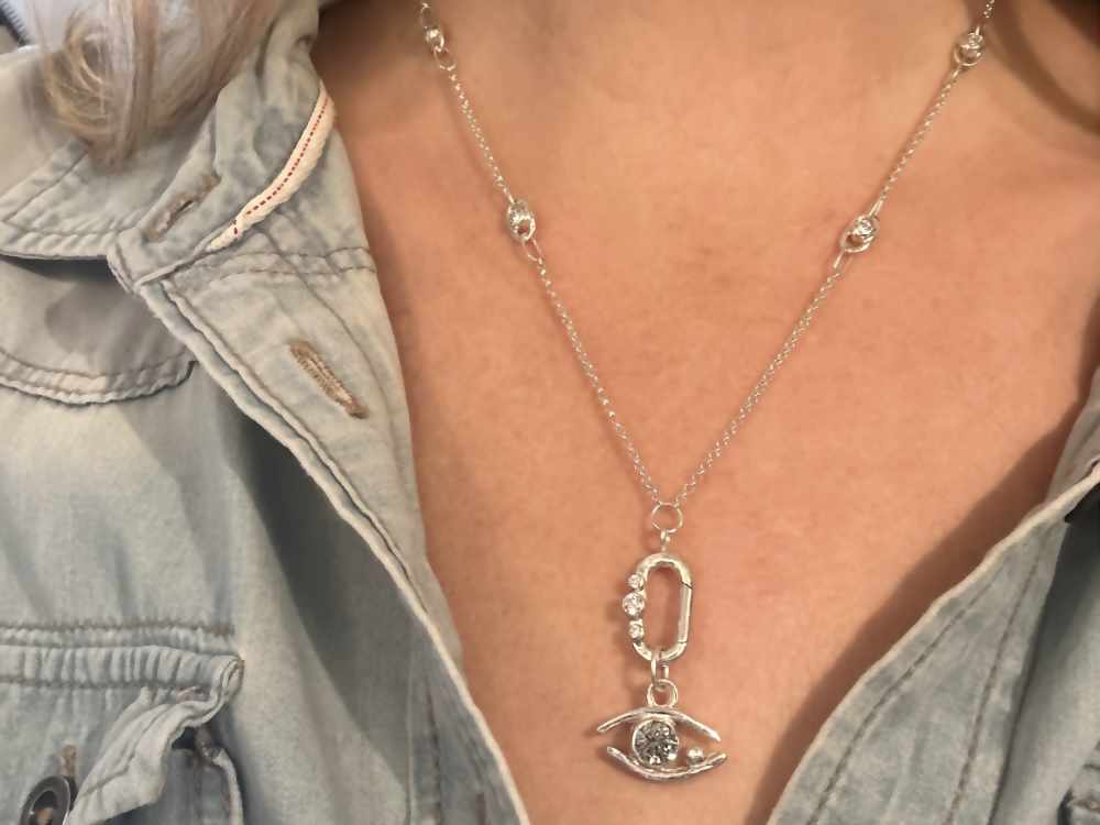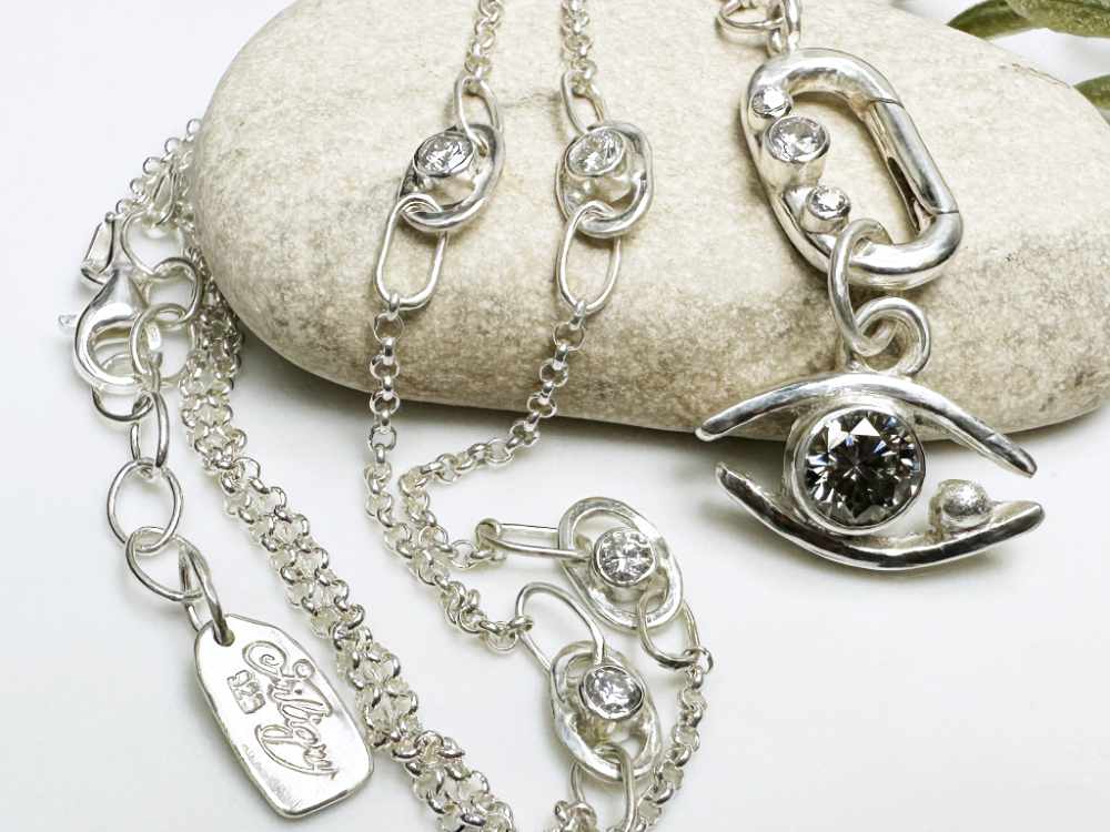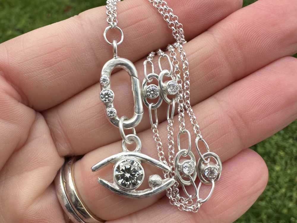 Diese außergewöhnliche, handgefertigte Charm Halskette mit Anhänger in Form eines bösen Blicks aus Moissanit ist aus hochwertigem Silber gefertigt und besticht durch ihr zeitloses und elegantes Design. Der funkelnde Moissanit, bekannt für seine Brillanz und sein feuriges Leuchten.