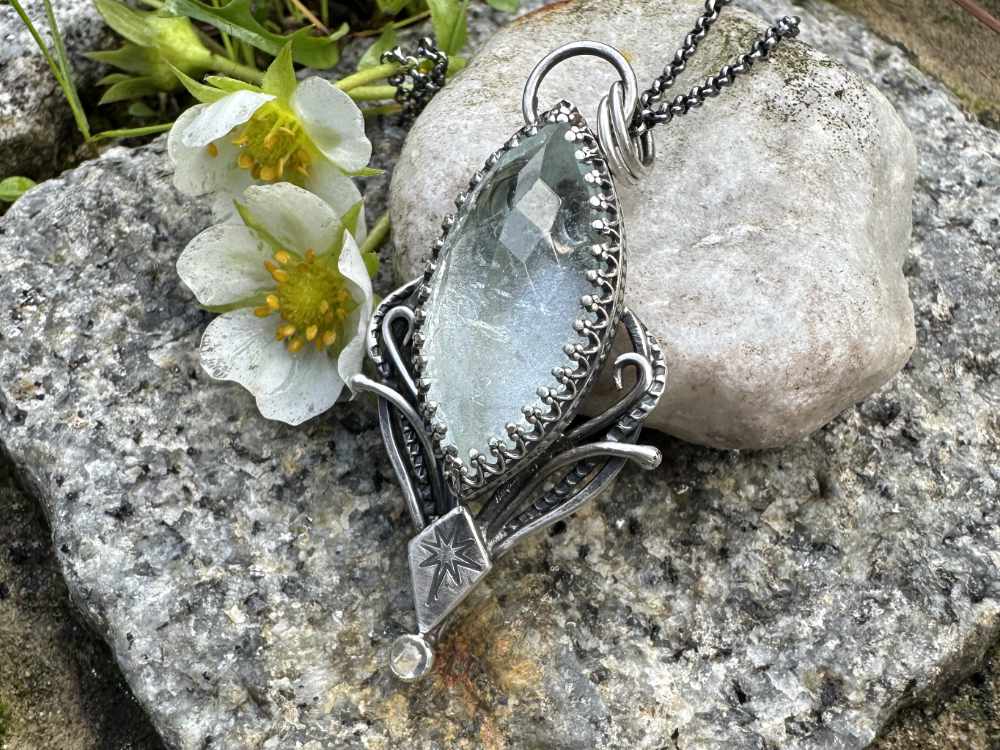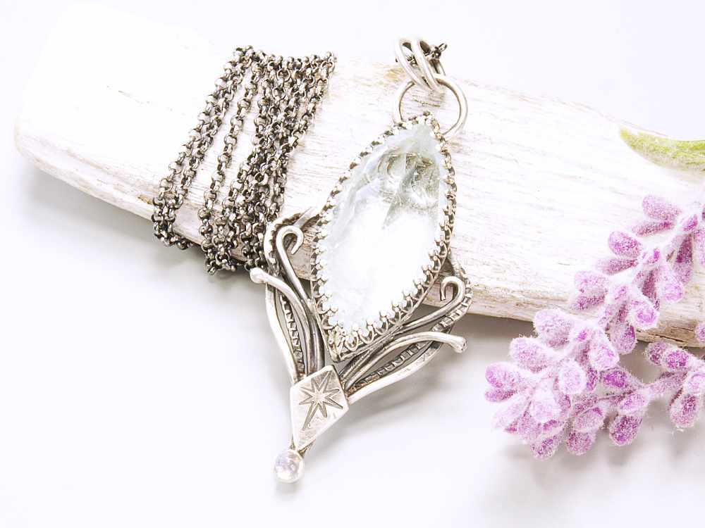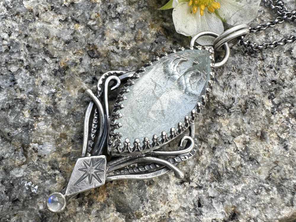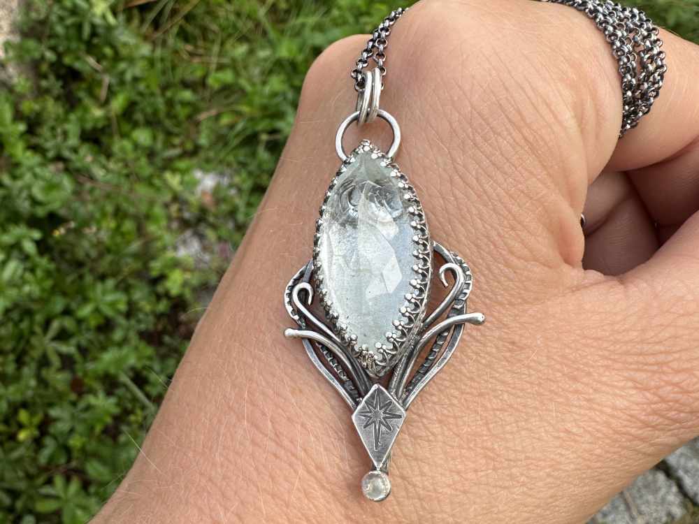 Handgefertigte Anhänger aus 935er Silber wurde mit einem wunderschönen weiße Topas und Mondstein gefertigt. Hinter dem weiße Topas ist eine kleine Mond versteckt.
