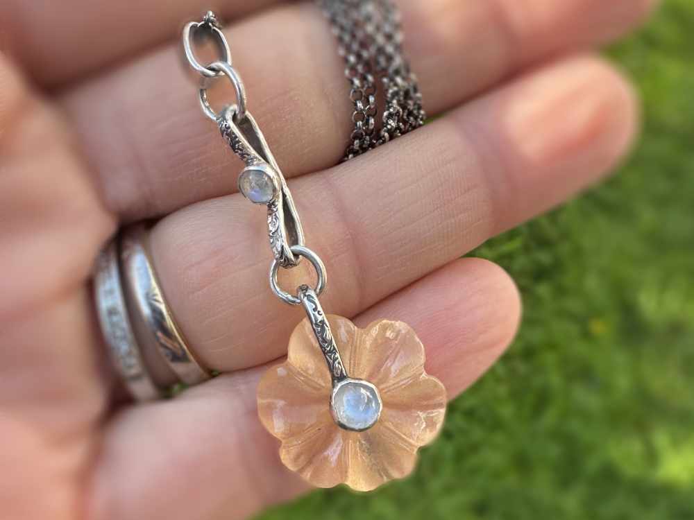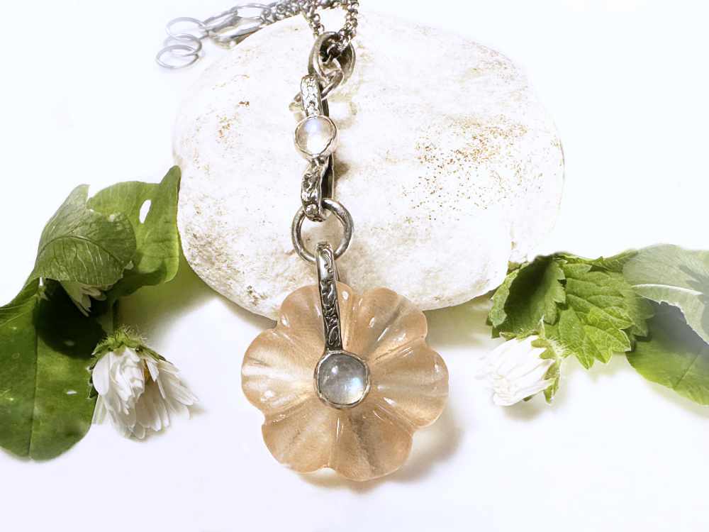 Dieser Blumenanhänger präsentiert einen atemberaubenden Pfirsich-Mondstein in geschnitzter Blumenform, kombiniert mit blauen Blitz-Mondstein. Der Anhänger und die Kette wurden geschwärzt und anschließend auf Hochglanz poliert, um alle schönen Details für einen schönen Kontrast zu erhalten.