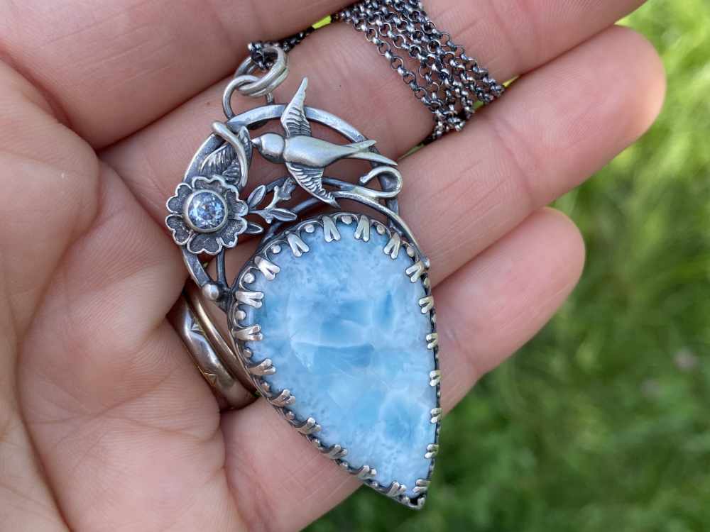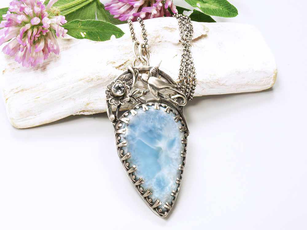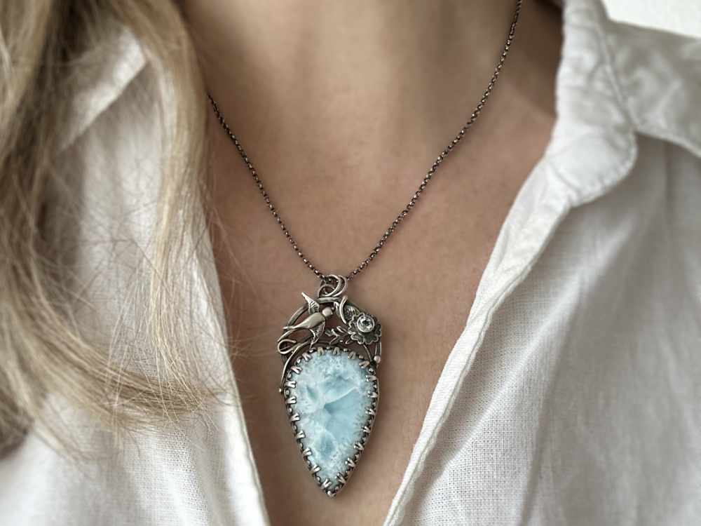 Dieser kunstvoll gefertigte Schwalbenanhänger aus Silber besticht durch die Kombination eines bezaubernden Larimars und eines harmonisch abgestimmten Aquamarins. Mit seinen sanften Blau- und Weißtönen erinnert der Larimar an das türkisfarbene Karibische Meer, das sich am Horizont mit dem Himmel vereint, und verleiht dem Schmuckstück eine beruhigende, träumerische Atmosphäre.