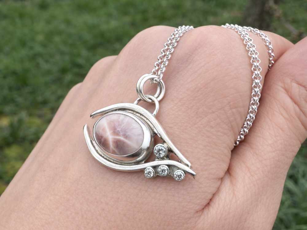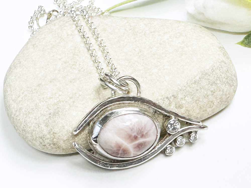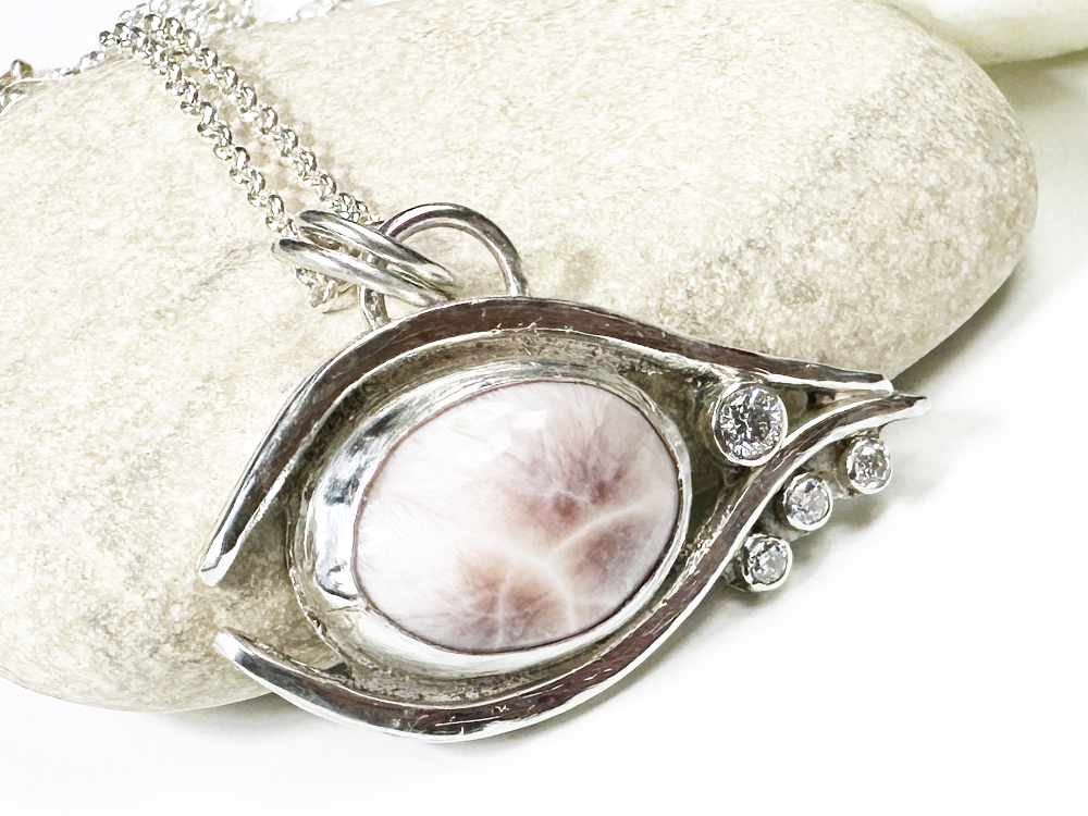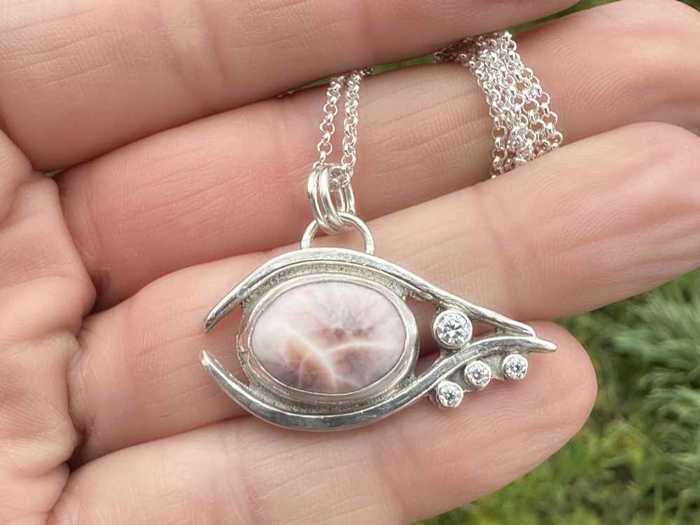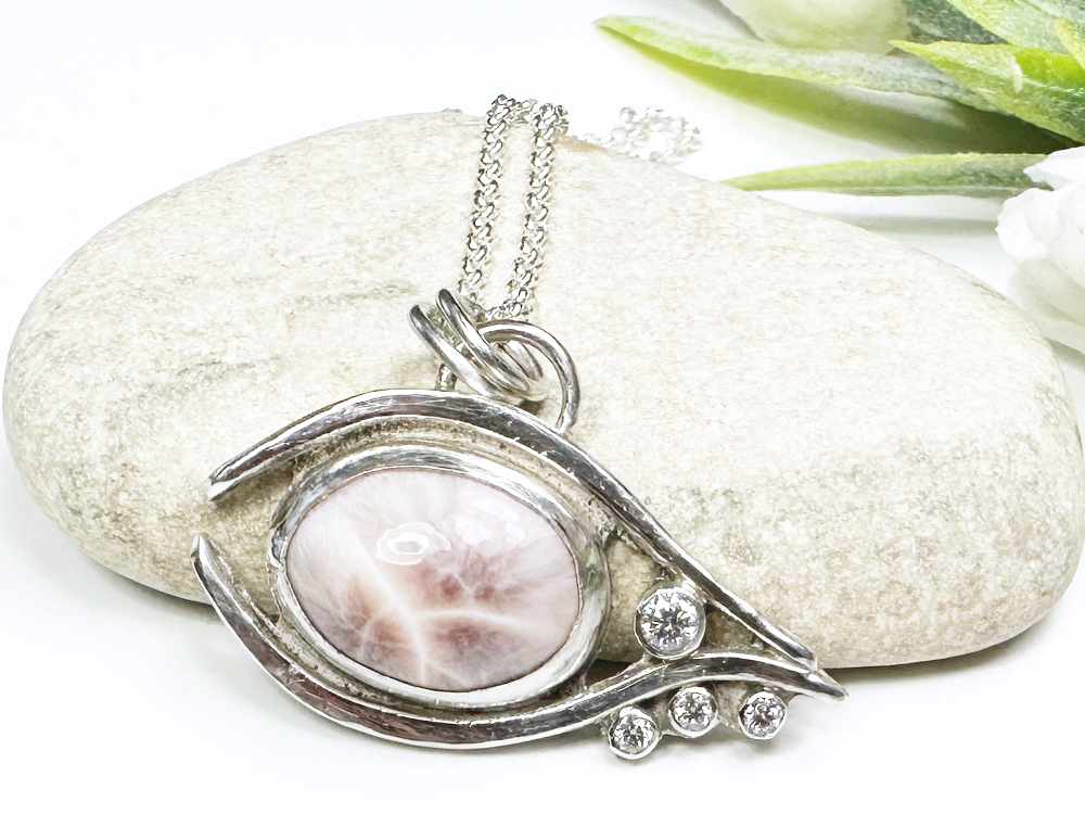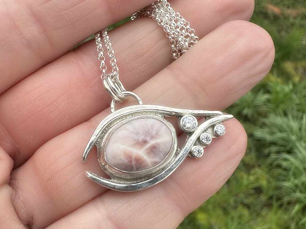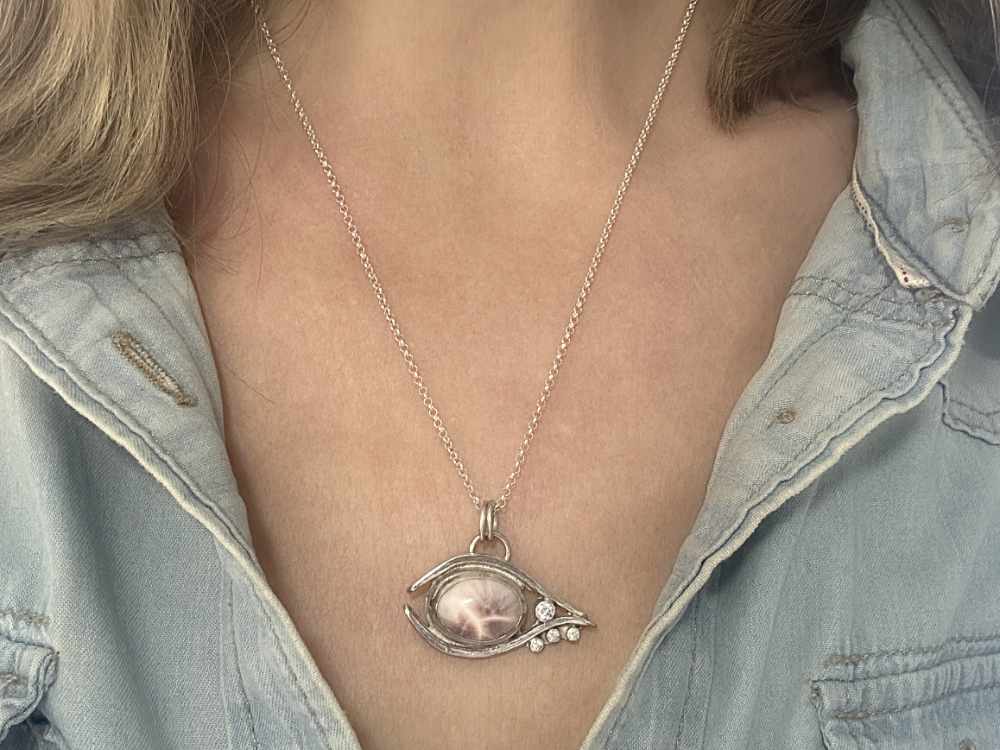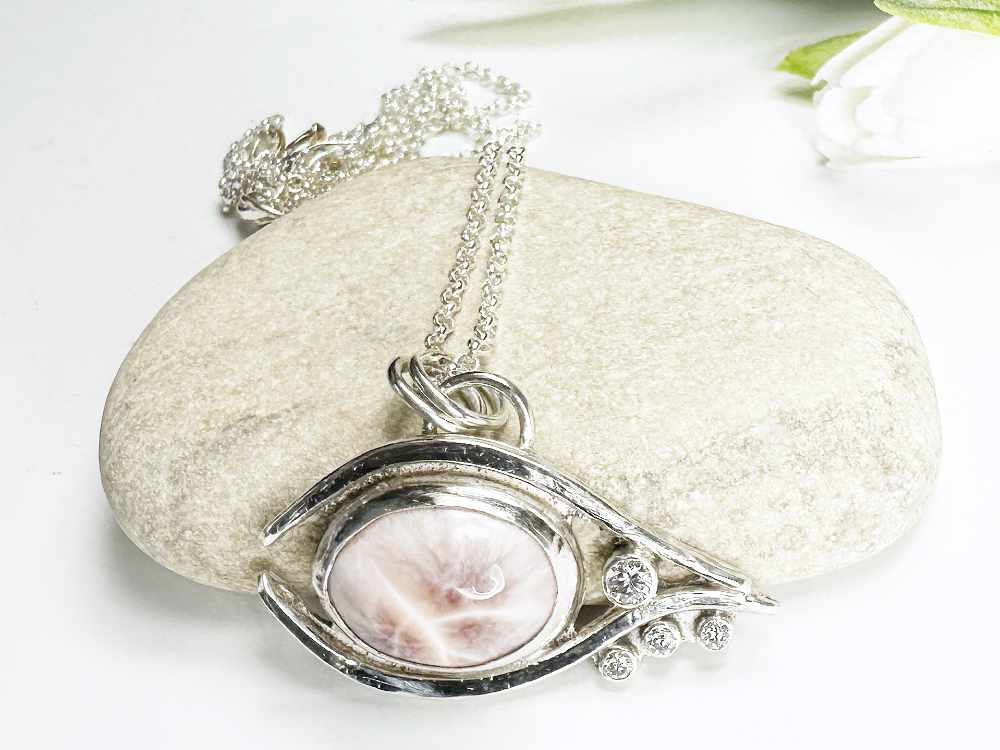 Im Zentrum des Designs steht ein pinker Larimar, der mit seinen einzigartigen Maserungen und sanften Rosé-Farbtönen jedes Schmuckstück zu einem Unikat macht. Funkelnde Moissanite setzen strahlende Akzente und unterstreichen die Eleganz des Augen-Designs.