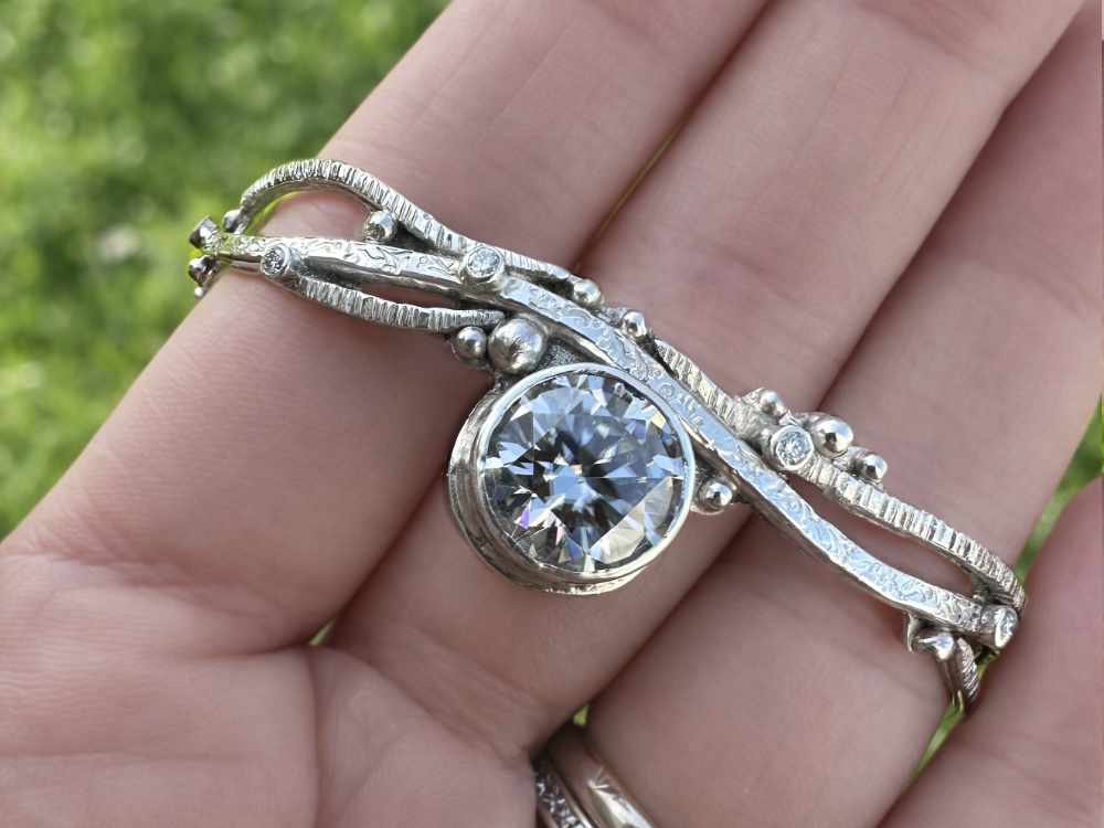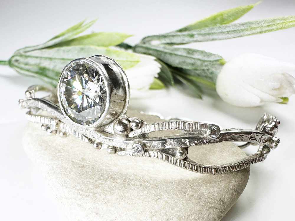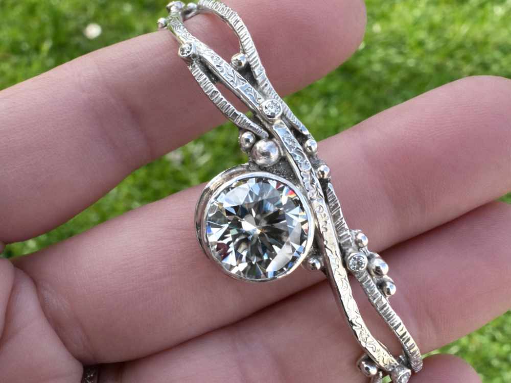 Dieser elegante Moissanite Armreif aus 925 Sterling Silber wurde von Hand gefertigt und überzeugt durch sein organisches Design, das an feine Zweige erinnert. Im Mittelpunkt steht ein großer, brillant geschliffener Moissanite, der mit außergewöhnlicher Brillanz und intensivem Funkeln begeistert. Kleine Akzentsteine verleihen dem Armreif zusätzliche Eleganz. Die hochglanzpolierten Silberflächen reflektieren das Licht wunderschön und bringen das Funkeln der Steine perfekt zur Geltung. Ein Verlängerungsstück ermöglicht eine flexible Anpassung – der Armreif kann locker oder enger getragen werden und eignet sich besonders gut für mittlere Handgelenke.