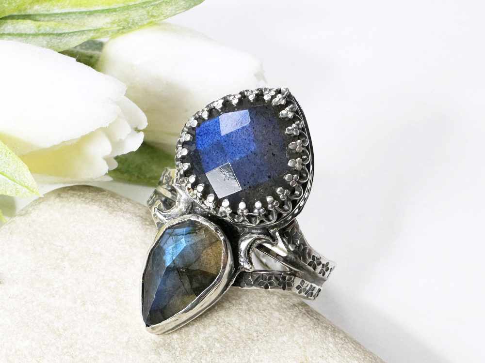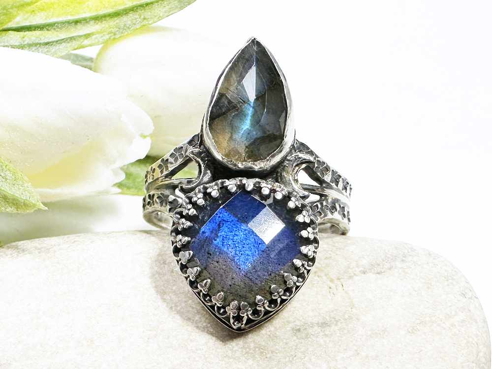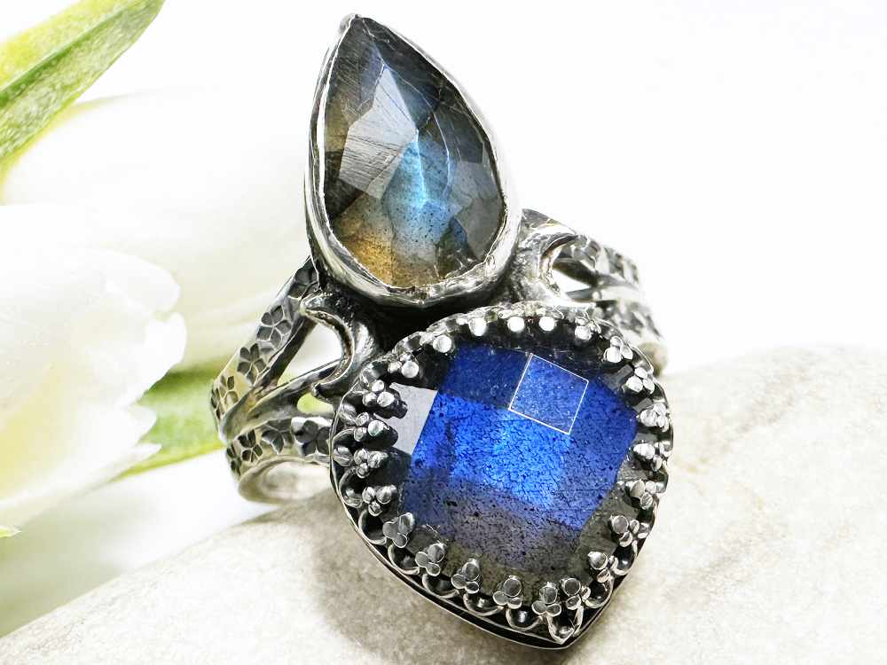 Die aufwendig gestaltete Fassung aus massivem 925 Silber besticht durch filigrane Blumendetails, die den Charakter des Rings hervorheben. Zwischen den schimmernden Labradoriten ziert ein filigraner Halbmond den Ring, der ihm eine bezaubernde Magie verleiht.